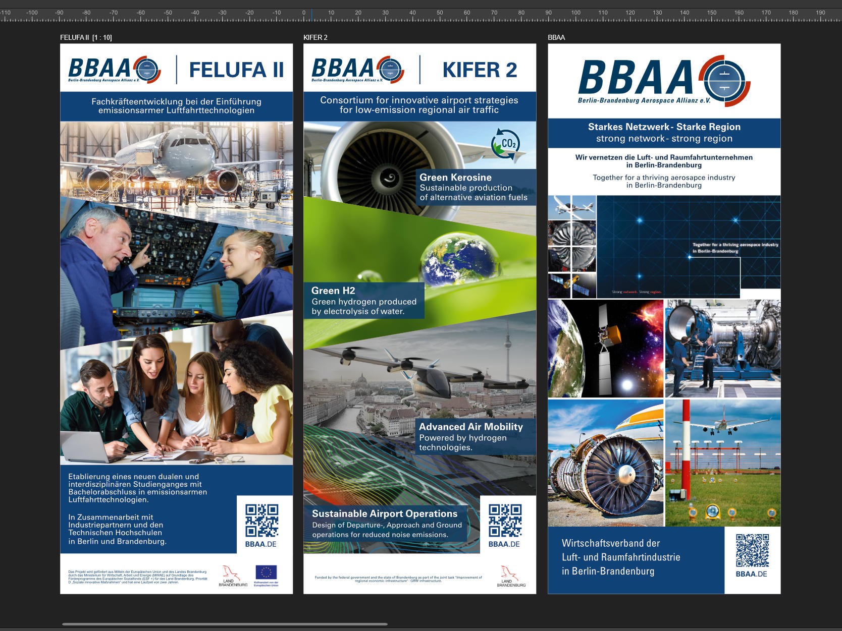 Für Messen und andere Events durfte ich die neuen Roll Ups – das sind selbststehende aufrollbare Flyerwände aus robustem Material und in 2m Größe – der einzelnen Abteilungen und Projekte in der BBAA gestalten und drucken. Die alten waren in die Jahre gekommen und durften nun an meine Vorarbeiten eines neuen Layouts angepasst werden…