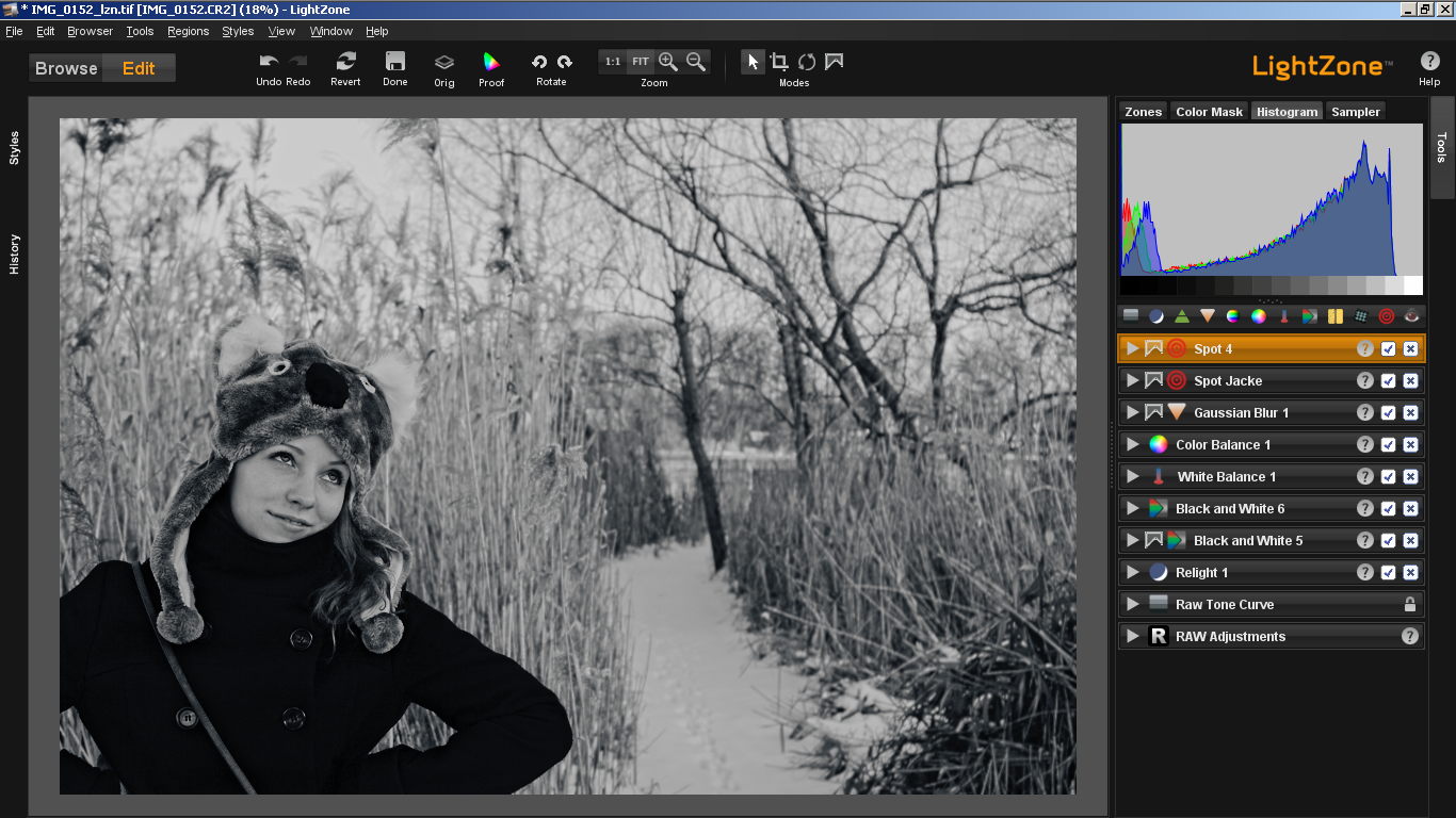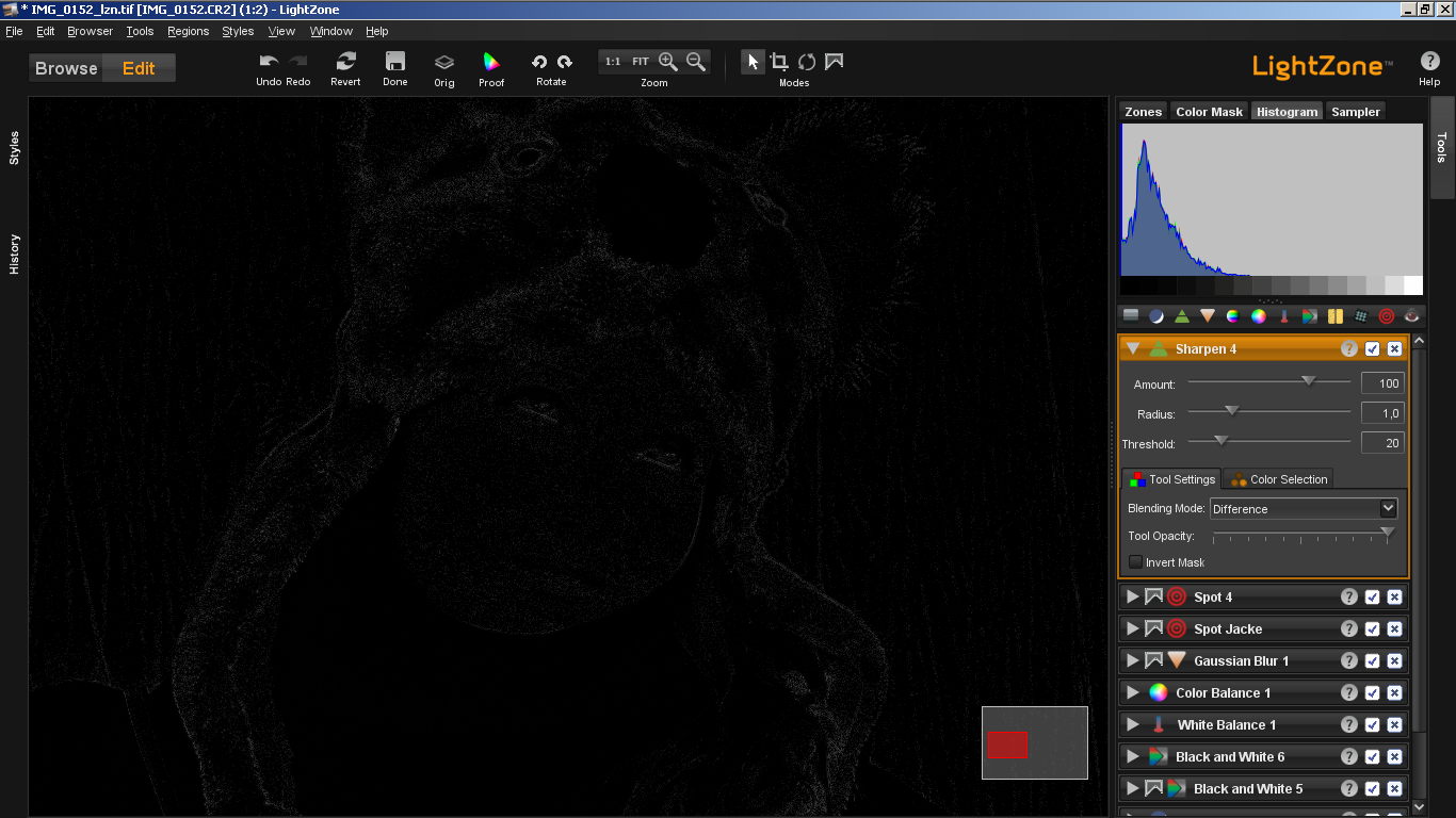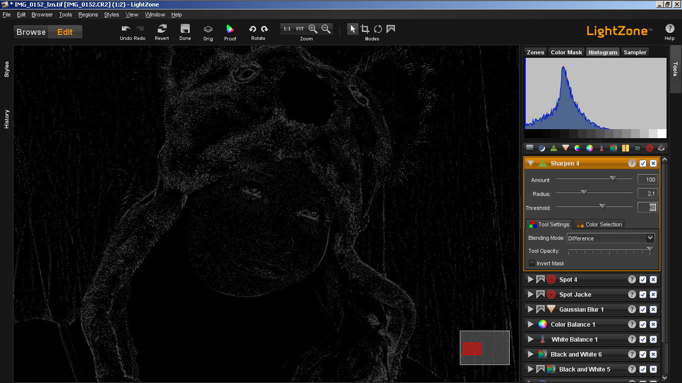 Wie also nun vorgehen? Ich gebe zu, ich war erst entäuscht, das der Maskierungsregler fehlt, aber man kann sich selbst helfen, denn in Lightzone kann man jedes Tool auch mittels Ebeneeneigenschaften zumischen. Einer dieser Modi nennt sich „Difference“ und lässt das Bild ähnlich erscheinen wie eine klassische USMaske.