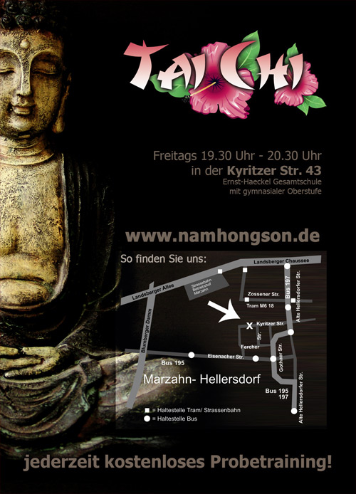Diese Woche gestaltete ich A6 Tai Chi Flyer für eine Sporthalle in Hellersdorf die sich speziell an interessierte Erwachsene richten sollte. Dabei wurde eine genaue Wegbeschreibung mit Bus und Bahn gezeichnet und in den Flyer integriert. Das Ergebnis kam sehr gut an.