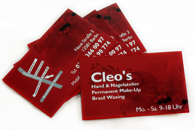 Diese Woche gab es mal wieder Drucksachen. Für das Berliner Nagelatelier „Cleo’s“ entwarf ich die neuen doppelseitigen Visitenkarten und 4 seitigen Flyer mit Preisliste.
