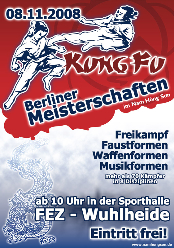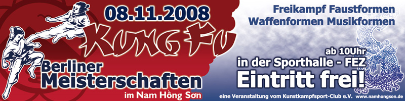 Die bisherigen Arbeiten für den Kunstkampfsport-Club e.V. aus Berlin kamen gut an. Für die diesjährigen Berliner Kung Fu Meisterschaften am 8.11.2008 im Nam Hong Son Stil gestaltete ich gerade ein modernes und Aussagekräftiges Layout. Die Grafik für die Plakate und Flyer gingen auch gleich durch meine Hand in den Druck und zusätzlich wird gerade ein Banner für den Eingangsbereich der Veranstaltung entworfen.