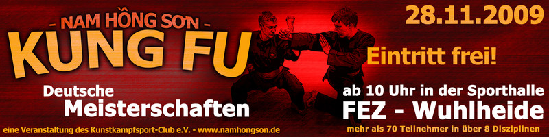 Wie im letzten Jahr so übernahm ich auch in diesem Jahr die Konzeption der Plakate und Werbebanner für die Deutschen Meisterschaften im Namhongson Kung Fu in der Berliner Wuhlheide. Der erste Entwurf zum Plakat kam sehr gut an. Problematisch wurde es ein wenig beim Banner, wo ich schnell merkte, das ich nicht alle grafischen Elemente so wiedergeben kann wie auf dem Plakat. Nichts desto trotz, kam auch dieses Jahr ein Layout heraus, das ins Auge sticht und sich von den meisten anderen Kampfsport und Kampfkunst Werbungen stark abhebt.